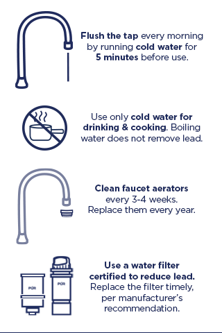 - Flush your pipes by running the cold water. Run your tap for at least 5 minutes every morning or anytime the water pipes have been sitting.
