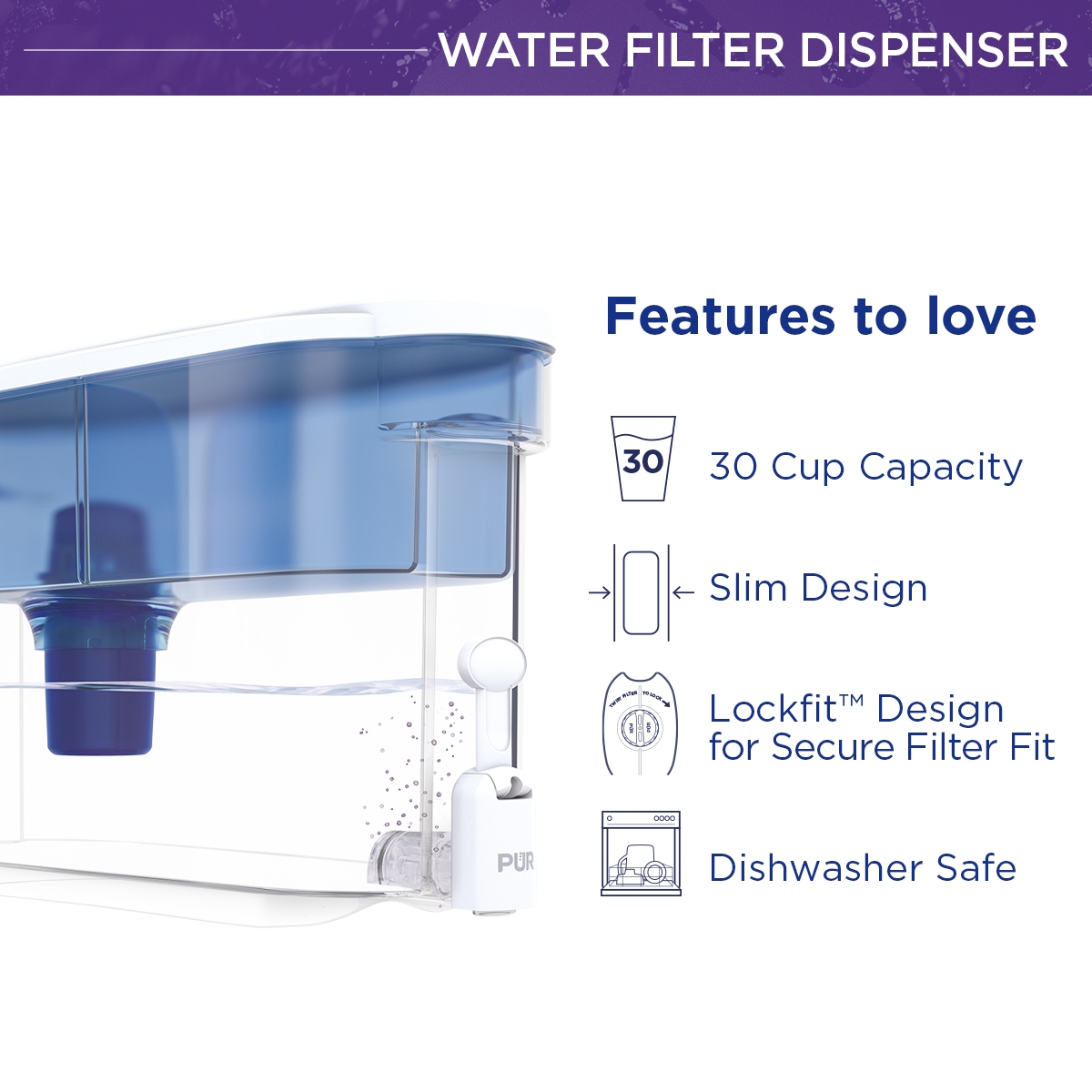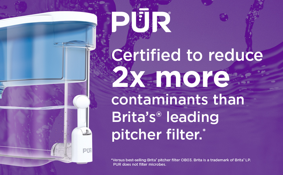 Enjoy cleaner, great-tasting water with a PUR large capacity dispenser. PUR dispensers include a PUR Filter, certified to reduce 2x more contaminants than the Brita’s® leading pitcher filter.¹,²