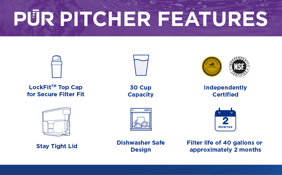 Genuine PUR pitcher filters are rigorously tested and certified by NSF to reduce chlorine, mercury, copper, zinc and other chemical & physical substances.¹