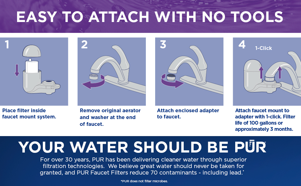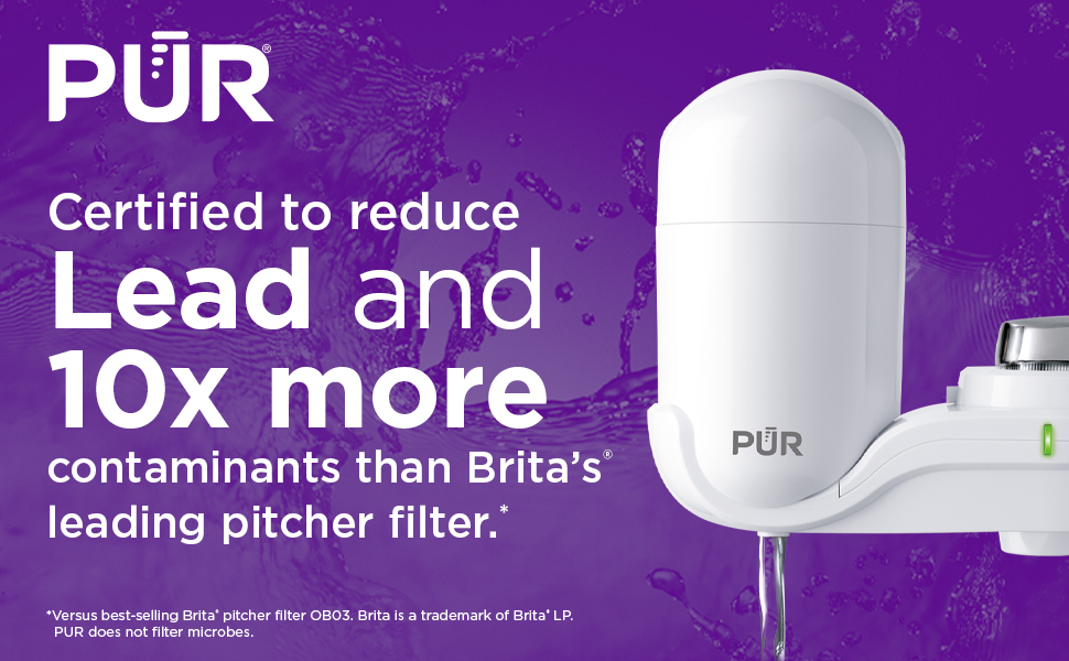 Enjoy cleaner, filtered water from your faucet with the PUR Faucet Filter System. Easy to attach, the PUR Faucet Filtration System includes a PUR Filter, certified to reduce lead and 10x more contaminants than the leading Brita pitcher filter.1,2
