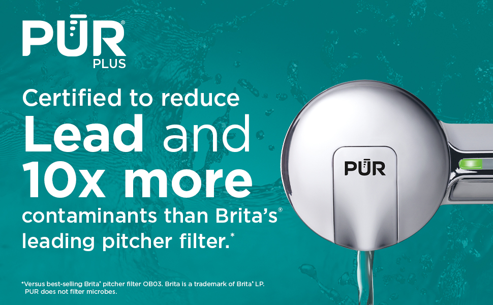 Enjoy cleaner, filtered water from your faucet with the PUR PLUS Faucet Filter System in Chrome finish. Certified to reduce lead and 10x more contaminants than Brita’s® leading pitcher filter.1,2 It is easy to attach and includes a Mineral Core™ Filter for great taste.