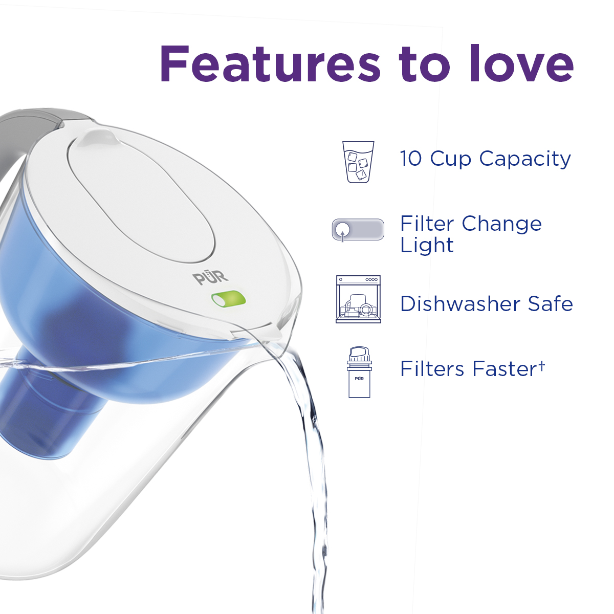 Quickly and easily enjoy cleaner, filtered water in your fridge with the PUR 10 Cup Pitcher Filtration System. This water filter pitcher features an easy-fill, stay-tight lid and one pitcher filter. Tap water may look clean, but can contain pollutants and contaminants from traveling through pipes. PUR pitcher water filters reduce these contaminants and substances.¹ All PUR pitchers are dishwasher safe.