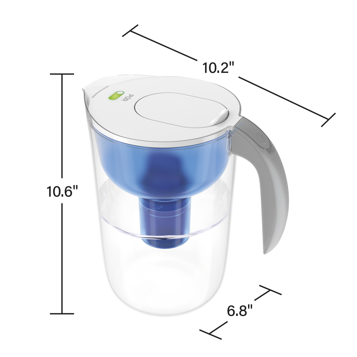 This PUR 10 cup pitcher has a slim, space saving design that fits easily in your fridge, while the comfort-grip handle and easy-fill lid make it easy to use. The filter lasts up to 2 months and gives you 40 gallons (or 640 8oz cups) of cleaner, great-tasting water.
