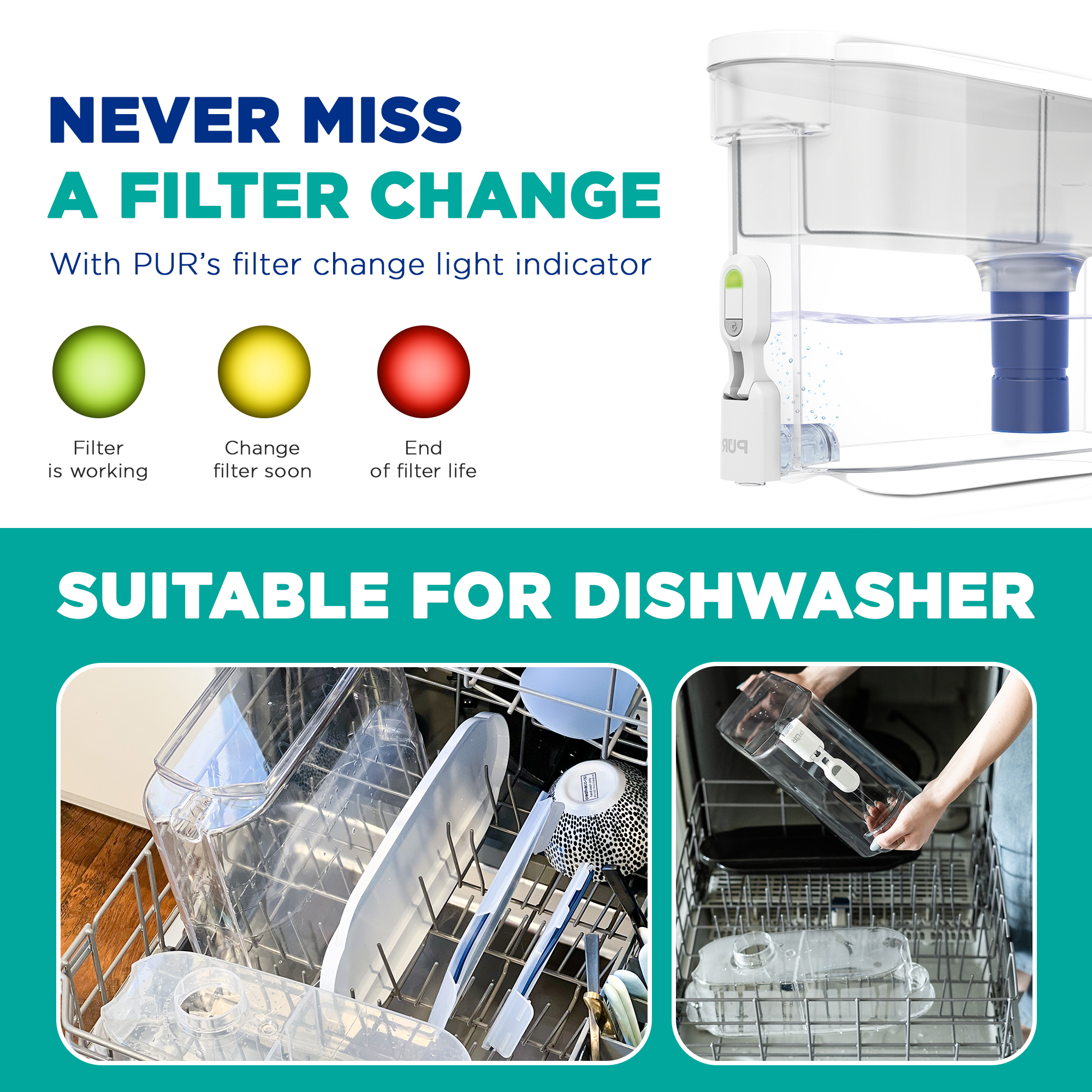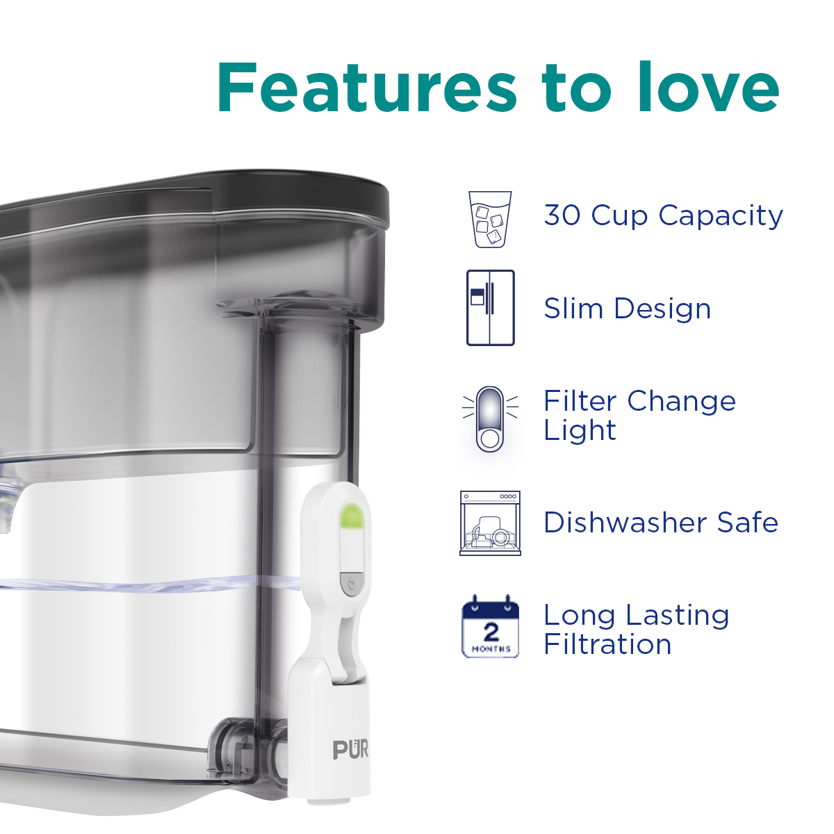 Enjoy better tasting water with the PUR PLUS 30-Cup Water Filter Dispenser (available in 2 colors), which has been engineered for superior, 3-in-1 powerful water filtration to reduce over 20 chemical & physical substances that tend to cause bad taste and odor in your drinking water. Each Genuine PUR PLUS dispenser filter is certified for up to 40 gallons, or 2-months of use.