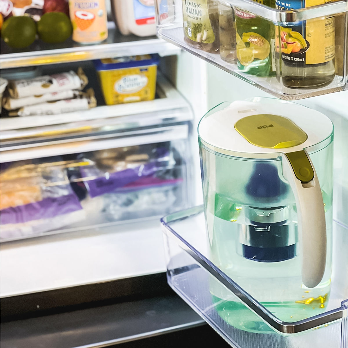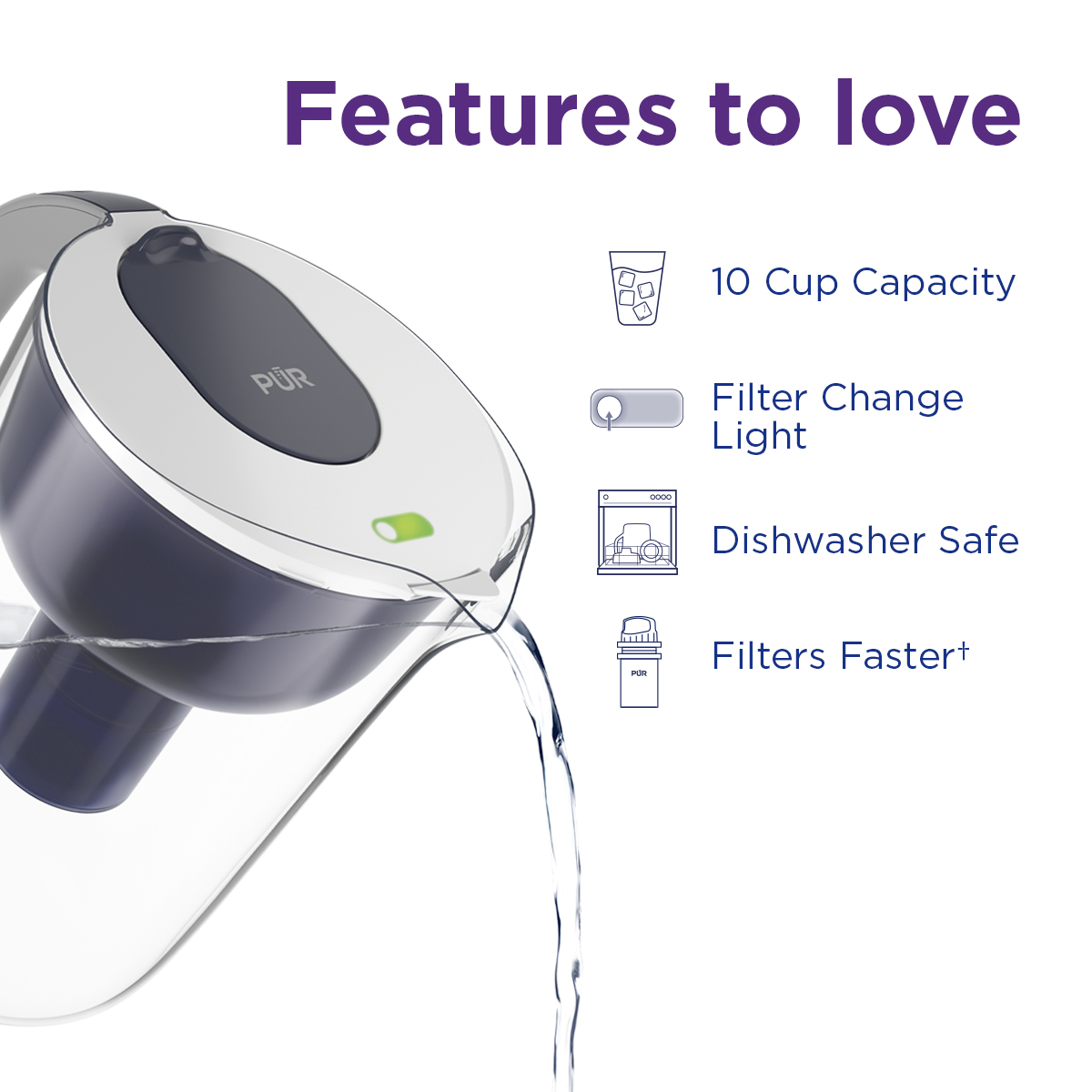 Quickly and easily enjoy cleaner, filtered water in your fridge with the PUR 10 Cup Pitcher Filtration System. This water filter pitcher features an easy-fill, stay-tight lid and one pitcher filter. Tap water may look clean, but can contain pollutants and contaminants from traveling through pipes. PUR pitcher water filters reduce these contaminants and substances.¹ All PUR pitchers are dishwasher safe.