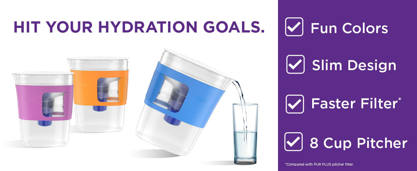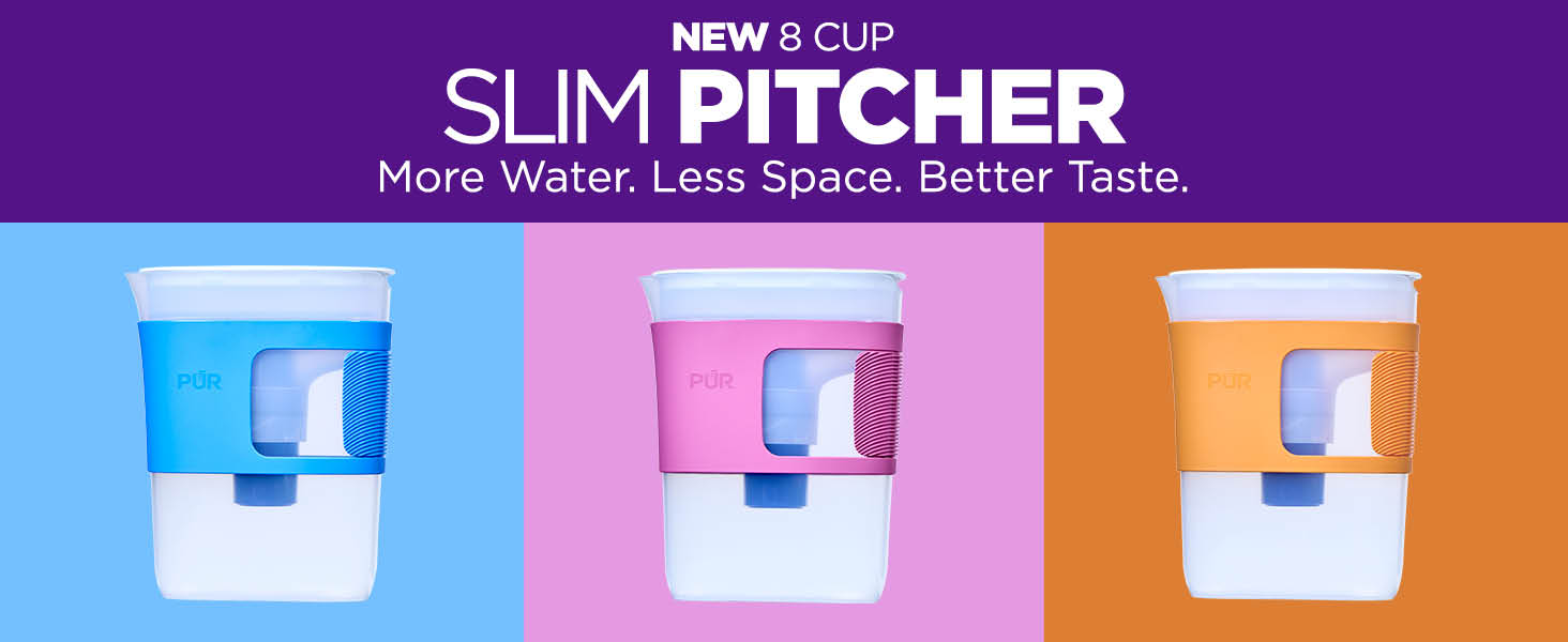 Enjoy cleaner, great-tasting water with the PUR 8 Cup Slim Water Filter Pitcher. Perfect for dorm rooms, mini fridges, and small kitchens, this compact water filter pitcher saves space without sacrificing capacity—holding 33% more water than standard small pitchers.