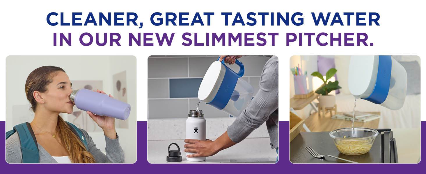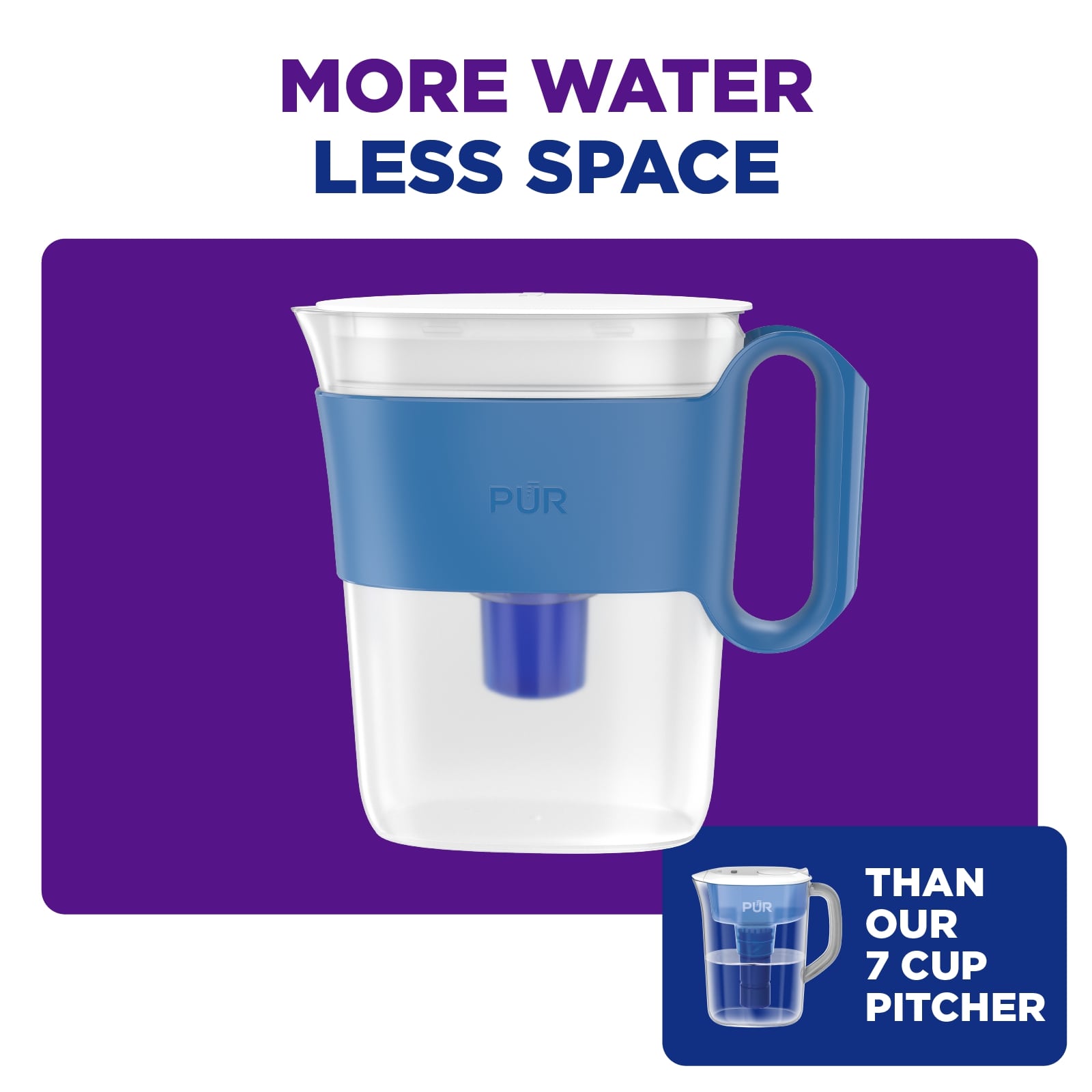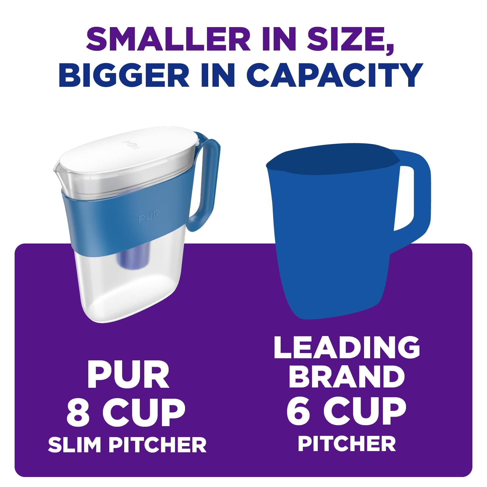 Enjoy cleaner, great-tasting water with the PUR 8 Cup Slim Water Filter Pitcher. Perfect for dorm rooms, mini fridges, and small kitchens, this compact water filter pitcher saves space without sacrificing capacity—holding 33% more water than standard small pitchers.