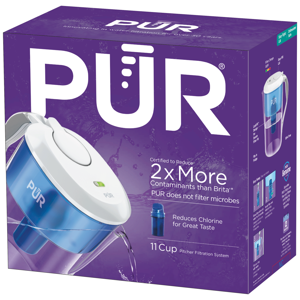 The PUR 11 Cup Pitcher Filtration System offers cleaner water quickly and easily, right in your fridge. This water filter pitcher features an easy-fill, stay-tight lid, a built-in LED filter life indicator and one pitcher filter. Tap water may look clean, but can contain pollutants and contaminants from travelling through pipes. PUR pitcher water filters reduce these contaminants and substances.¹ All PUR pitchers are dishwasher safe.